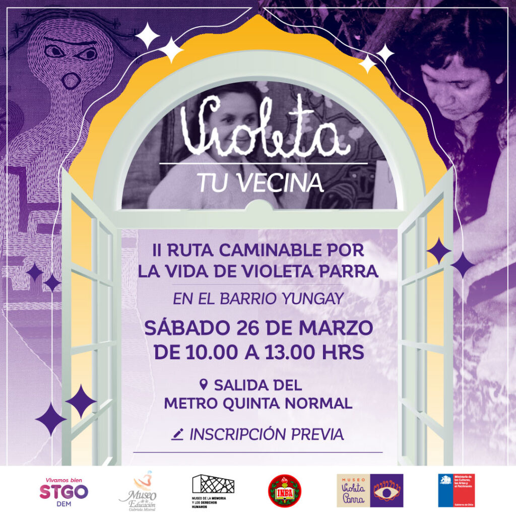 El próximo sábado 26 de marzo, nos despedimos de la exhibición «Violeta Parra: ir a Matucana, pasear por la Quinta» invitándoles a conocer algunos de los lugares que marcaron la biografía de la artista en el Barrio Yungay.