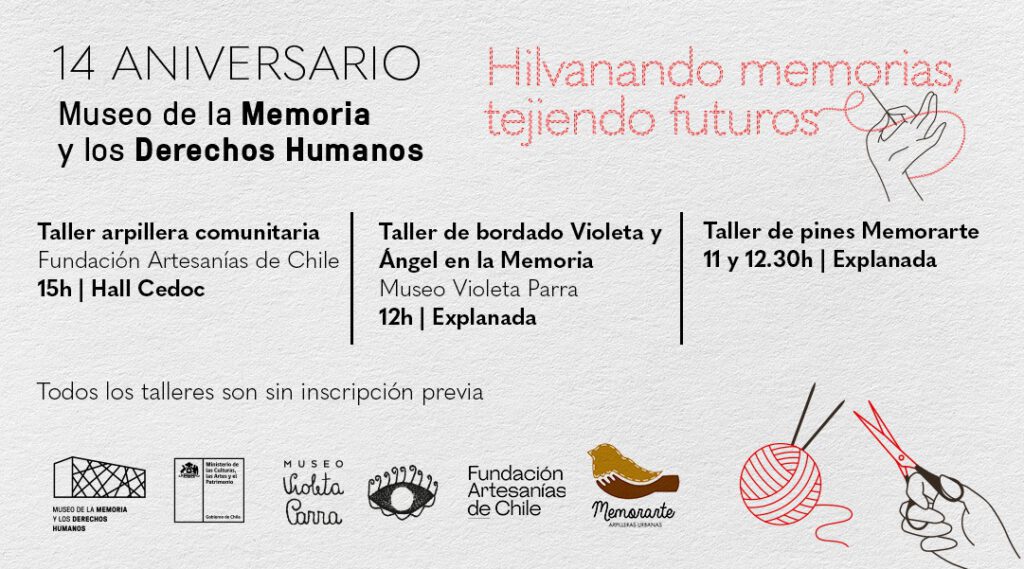 En el contexto del aniversario del Museo de la Memoria y los Derechos Humanos, este taller de arte textil tiene el objetivo de dar a conocer el compromiso político y social de Violeta y Ángel Parra, a través de la exposición de reproducciones de fotografías, obras y música de ambos artistas vinculados a importantes acontecimientos políticos.