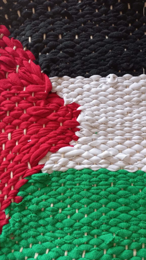 El taller consiste en enseñar la técnica de Ecotejido para crear de forma colectiva una serie de piezas textiles (en formato de individuales de mesa), para demostrar nuestro apoyo al Pueblo Palestino y  que serán parte de la actividad dedicada a Palestina que realizará la Cocina de Violeta el día 19 de Julio. Estas piezas textiles “vestirán” la mesa de la actividad dedicada a Palestina. Algunas se realizarán con ropa de los colores de la bandera Palestina y otros con colores en tonos Violeta.