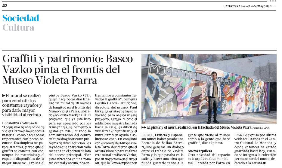 «Basco Vazko pinta el frontis del Museo Violeta Parra» en La Tercera