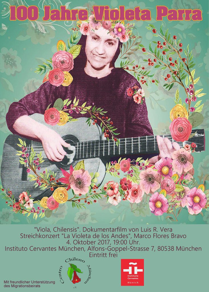 Afiche del homenaje realizado a Violeta Parra en la ciudad de Munich, Alemania, con motivo del centenario de su nacimiento. Se exhibe el filme “Viola Chilensis” y se presenta el concierto de cuerdas “Violeta de los Andes”.