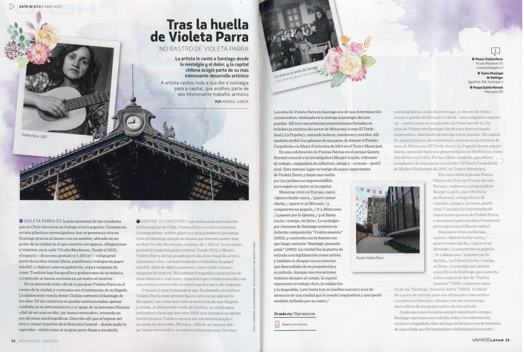 “Tras la huella de Violeta Parra”, texto de Marisol García. Artículo bilingüe castellano-portugués en el cual se destaca la relación de Violeta Parra con la capital de Chile y se insta a los viajeros a conocer el Museo Violeta Parra ubicado en un lugar central de Santiago (páginas 32 y 33).