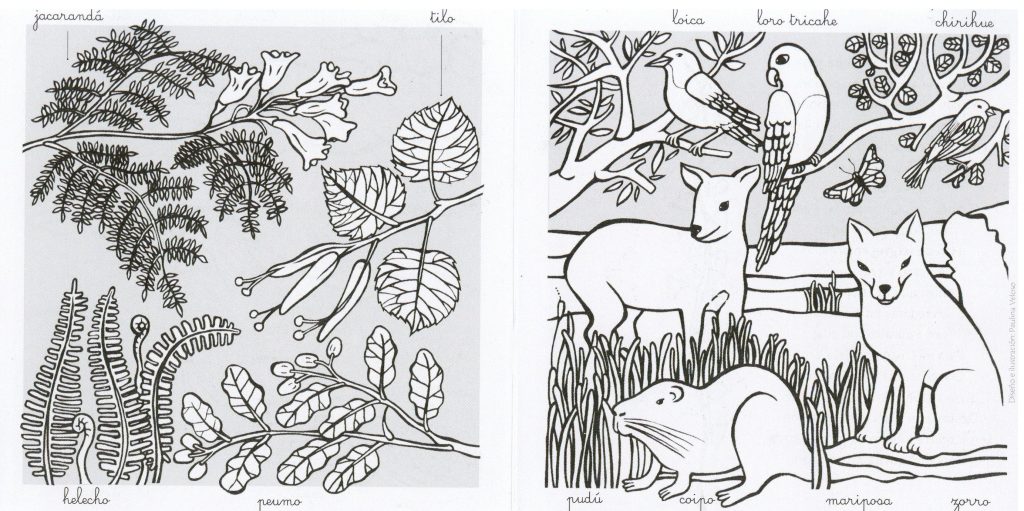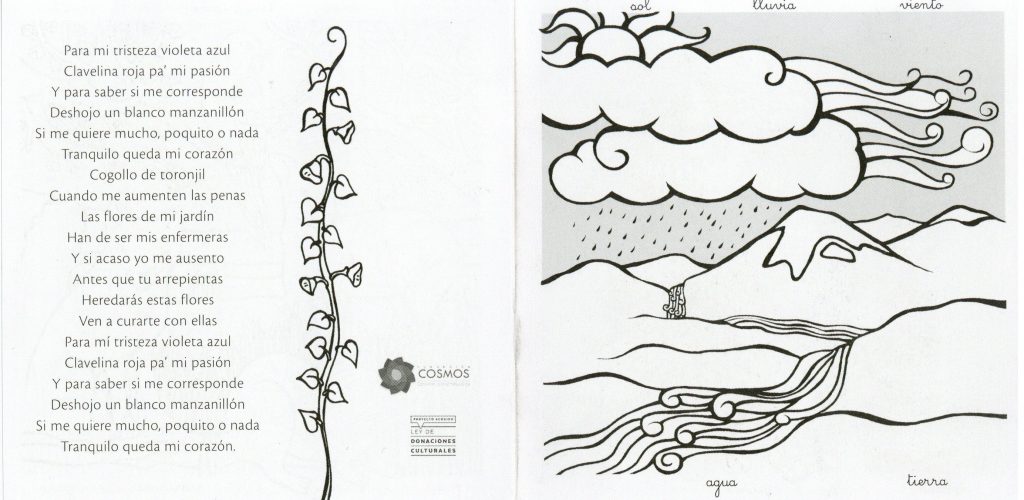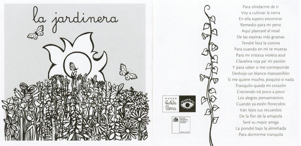 Folleto coloreable distribuido con motivo de la inauguración del espacio "La Jardinera" en el Museo Violeta Parra para celebrar el centenario del nacimiento de la artista.