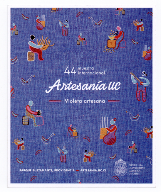 Invitación y afiche de la 44 muestra internacional de Artesanía UC, dedicada a la figura de Violeta Parra en ocasión del centenario de su nacimiento. La exposición se realizó en Parque Bustamante, entre los días 1 y 10 de diciembre de 2017.