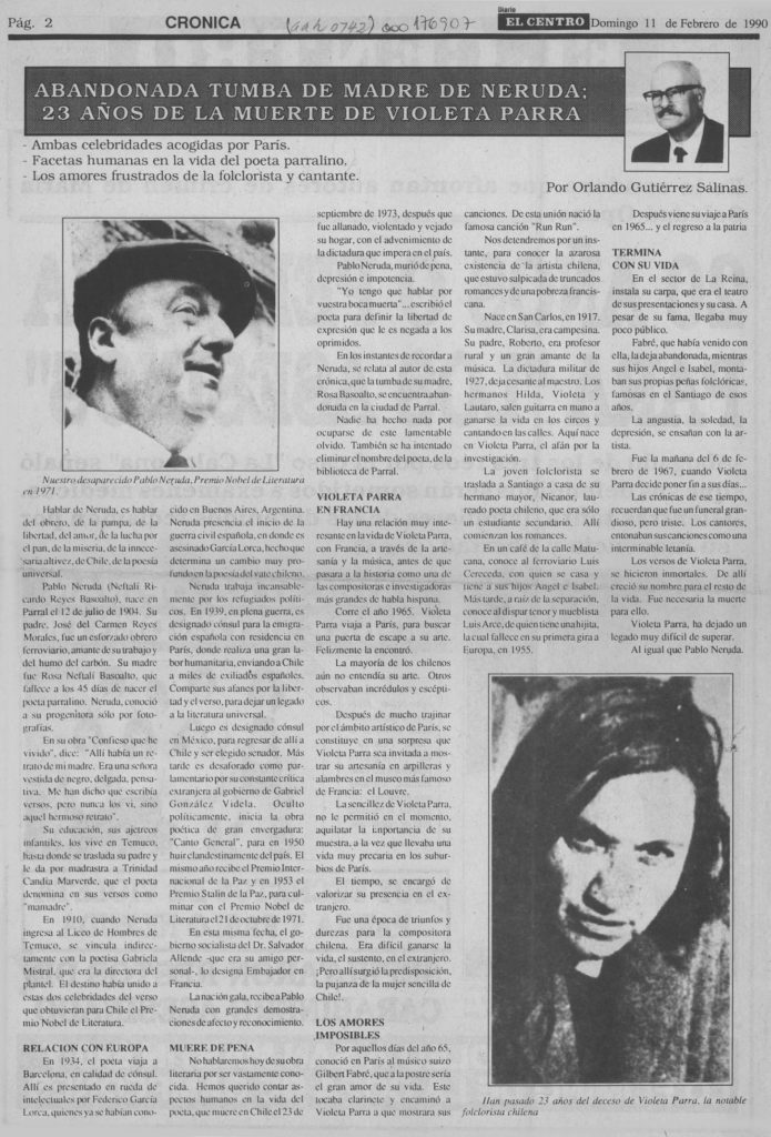 “Abandonada tumba de madre de Neruda. 23 años de la muerte de Violeta Parra”.