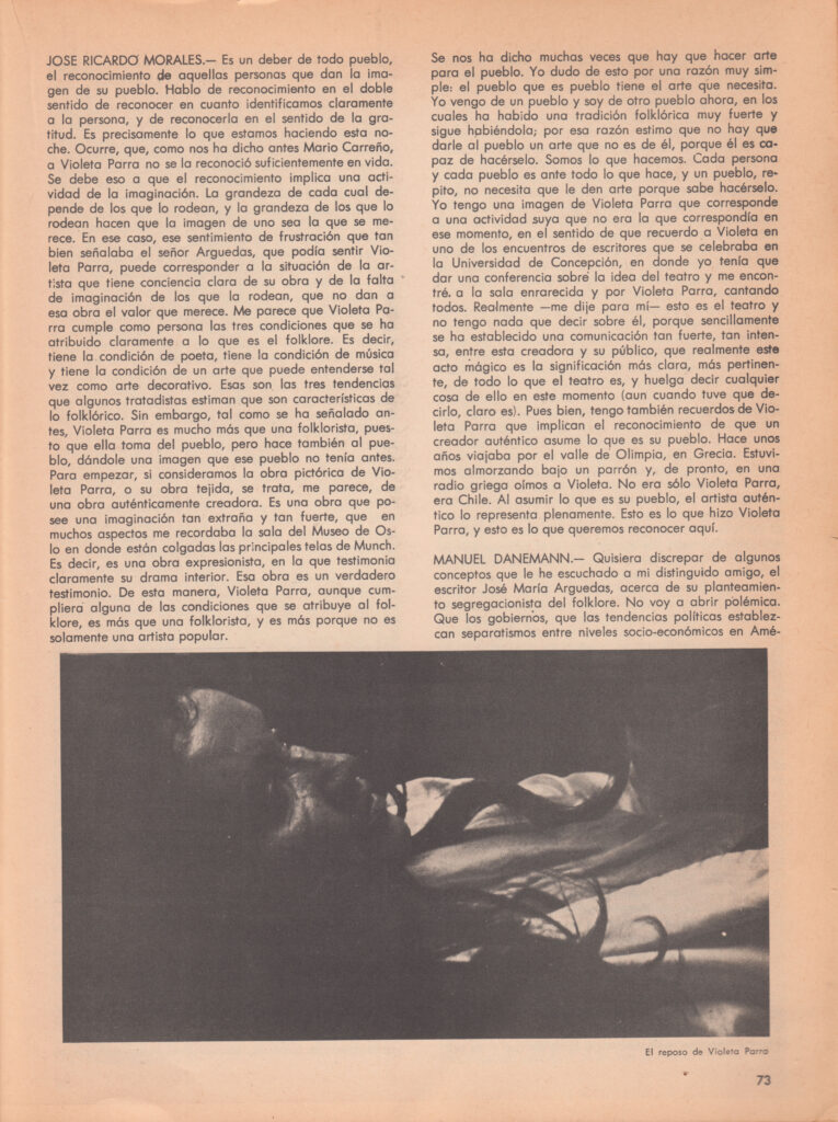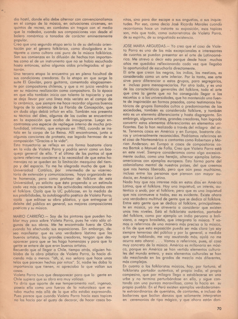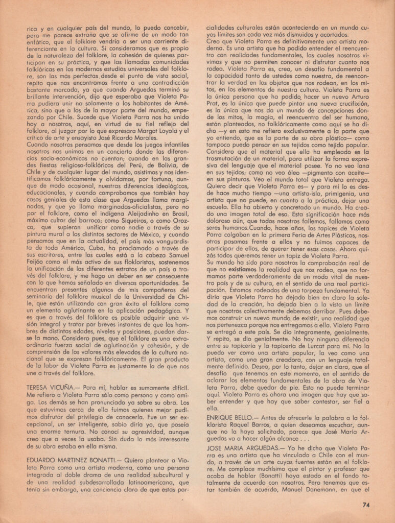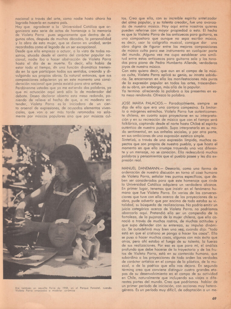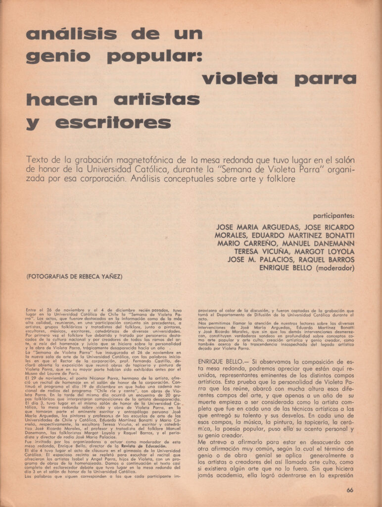 Transcripción realizada desde cinta magnetofónica que registró una mesa redonda de especialistas de distintas disciplinas de las artes y humanidades, realizada el 3 de diciembre de 1968 en el Salón de Honor de la Universidad Católica, institución que realizó un ciclo en homenaje a la artista, titulado "Semana de Violeta Parra" entre el 26 de noviembre y el 4 de diciembre de ese mismo año. Este homenaje incluyó una exposición con obras de Violeta en dependencias de dicha casa de estudios. Contiene fotografías tomadas a la artista por Rebeca Yáñez.