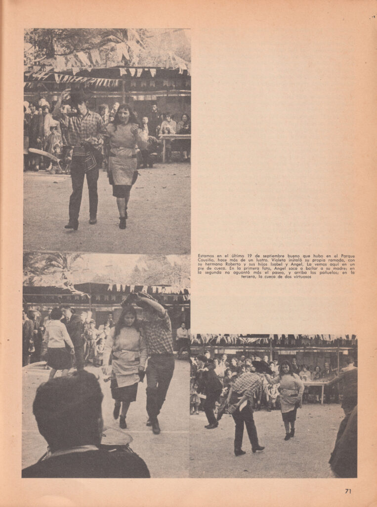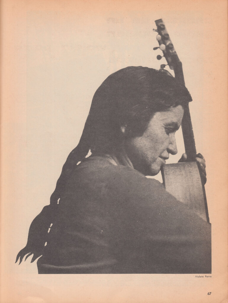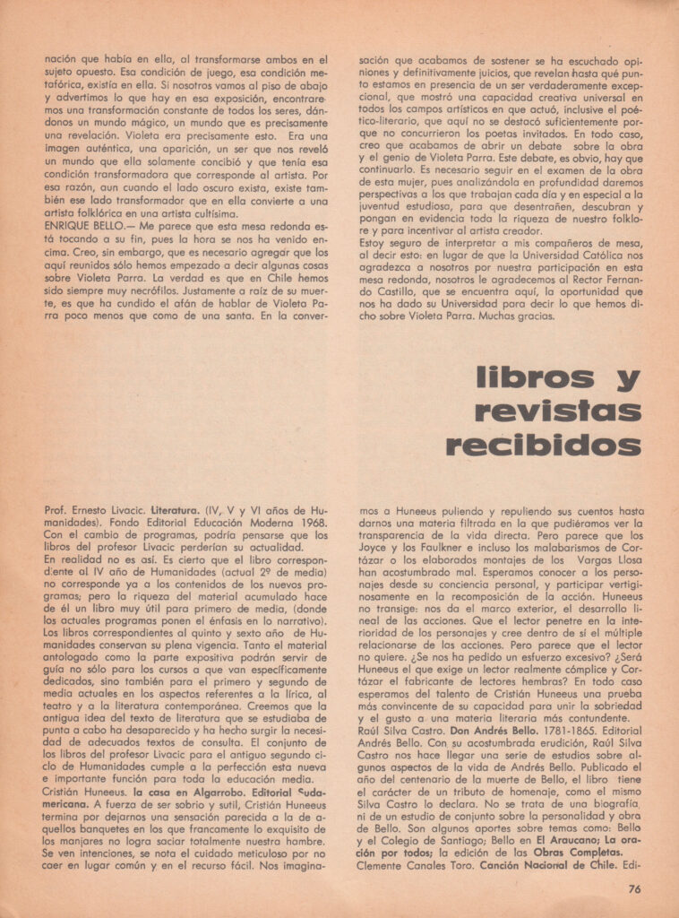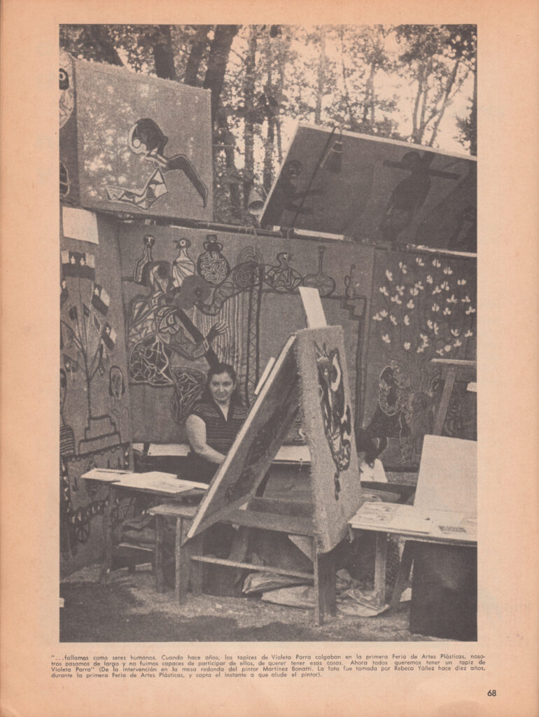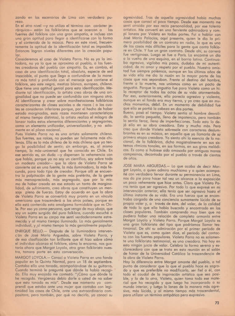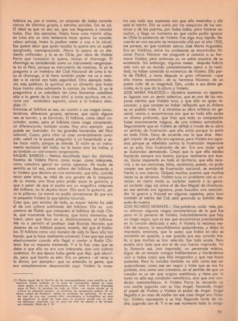 Transcripción realizada desde cinta magnetofónica que registró una mesa redonda de especialistas de distintas disciplinas de las artes y humanidades, realizada el 3 de diciembre de 1968 en el Salón de Honor de la Universidad Católica, institución que realizó un ciclo en homenaje a la artista, titulado "Semana de Violeta Parra" entre el 26 de noviembre y el 4 de diciembre de ese mismo año. Este homenaje incluyó una exposición con obras de Violeta en dependencias de dicha casa de estudios. Contiene fotografías tomadas a la artista por Rebeca Yáñez.