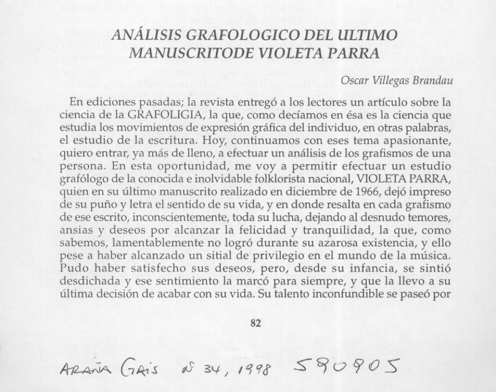 Curioso artículo dedicado al análisis de los grafismos de una persona, en este caso de Violeta Parra, a partir de un manuscrito de 1966. Incursionando en interpretaciones que relacionan la escritura con la biografía (infancias y otros avatares), el tono del análisis es el siguiente: el “revuelo psíquico” aflora en la escritura. “Cada parada, detención en el desenvolvimiento gráfico, corresponde a una interrupción o corte en la conducción nerviosa que rige dicho impulso, tal suspenso, puede ser originado por una pausa reflexionar, para concentrarse conscientemente sobre algo, o también puede reclamar como reff ejo inconsciente, inseguridad, indecisión, vacilación, temor o dificultad para adaptarse a los problemas de la vida cotidiana.”