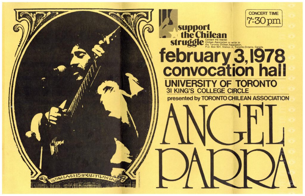 Afiche de la presentación de Ángel Parra en el 31 King's College Circle, organizada por la Toronto Chilean Association, y efectuada el 3 de febrero de 1978.