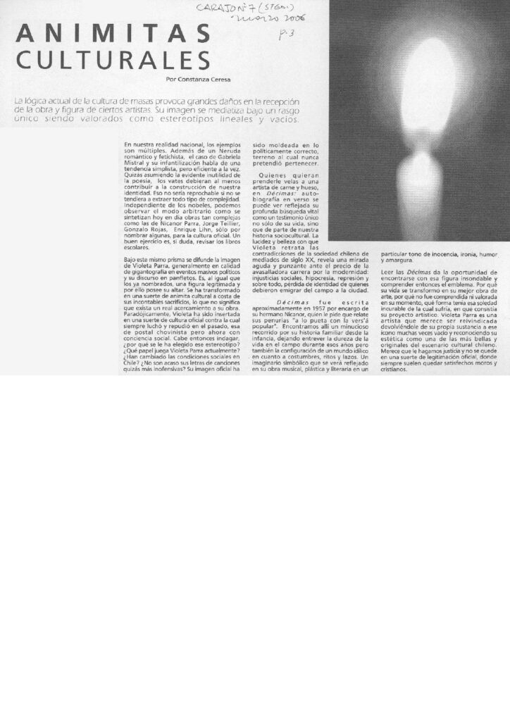 El artículo aborda, tomando como referencia las animitas del folclore popular, la veneración de figuras en la cultura de masas. Toma el caso de la difusión de la imagen de Violeta Parra en manifestaciones: “se ha transformado en una suerte de animita cultural a costa de sus incontables sacrificios, lo que no significa que exista un gran acercamiento a su obra”. Se refiere también a la lectura de las Décimas como una oportunidad de encontrarse con la figura insondable de la artista.