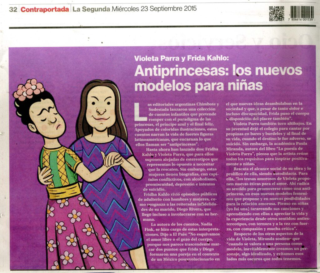Con una caricatura de Violeta Parra bailando con Frida Kahlo, la nota informa sobre la iniciativa “Antiprincesas” de la editorial Chimbote, Argentina, que lanza una colección de cuentos que rompen con el estereotipo del “príncipe azul” y los finales felices. Entre los títulos se contempla un texto ilustrado sobre Violeta Parra.