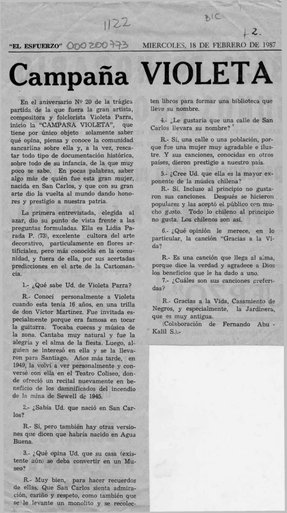 El diario El Comercio se refiere a una campaña realizada por la comunidad de San Carlos para conocer la opinión y conocimientos sobre Violeta Parra. Entrevistan a Cristina Urrutia una artista plástica de esa localidad.