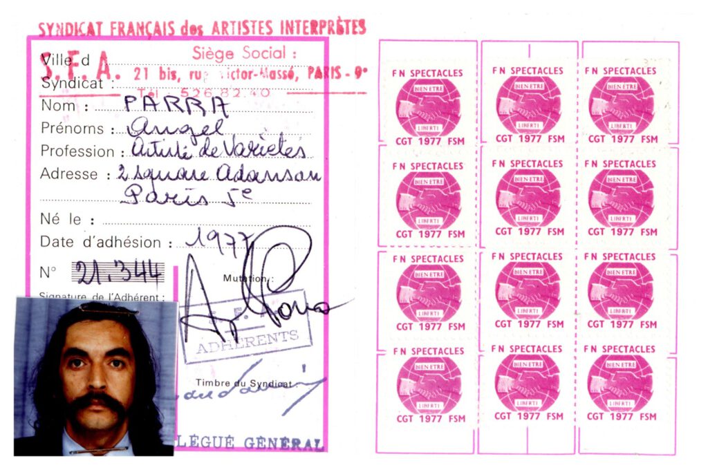 Carnet donde que acredita la suscripción de Ángel Parra al sindicato francés de artistas intérpretes. Incluye fotografía a color de Ángel Parra y su firma.