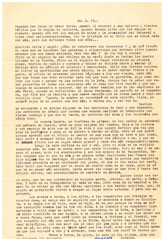 Carta de Osvaldo Rodríguez a Ángel Parra y Marta Orrego, París, 28 de febrero de 1973