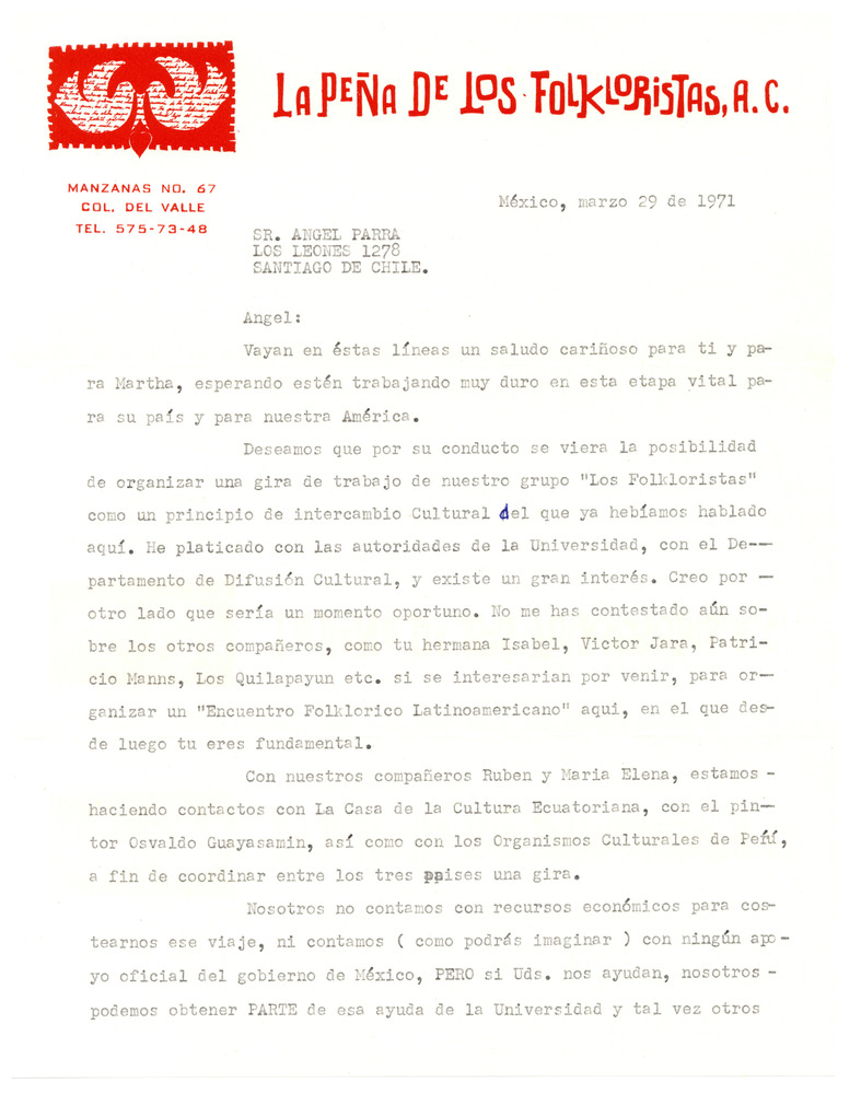 Carta de René Villanueva a Ángel Parra, México 29 de marzo 1971