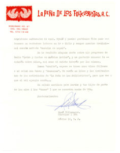 Carta mecanografiada donde René Villanueva le pide ayuda a Ángel Parra para organizar una gira del grupo Los Folkloristas y, además, pregunta por la posibilidad de un Encuentro Folklórico Latinoamericano con su participación y la de Isabel Parra, Víctor Jara, Patricio Manns y Quilapayún. Incluye firma de René Villanueva.