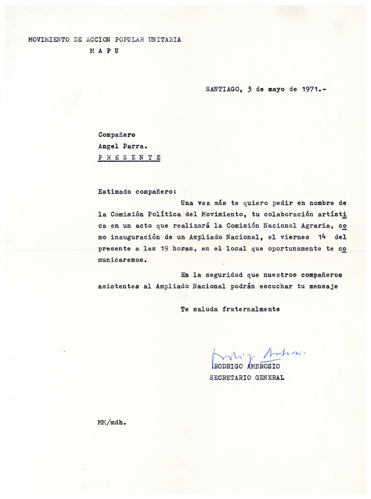 Carta mecanografiada de Rodrigo Ambrosio donde, en nombre del Movimiento de Acción Popular Unitaria (MAPU), le pide que participe de un acto de la Comisión Nacional Agraria. Incluye la firma de Rodrigo Ambrosio.
