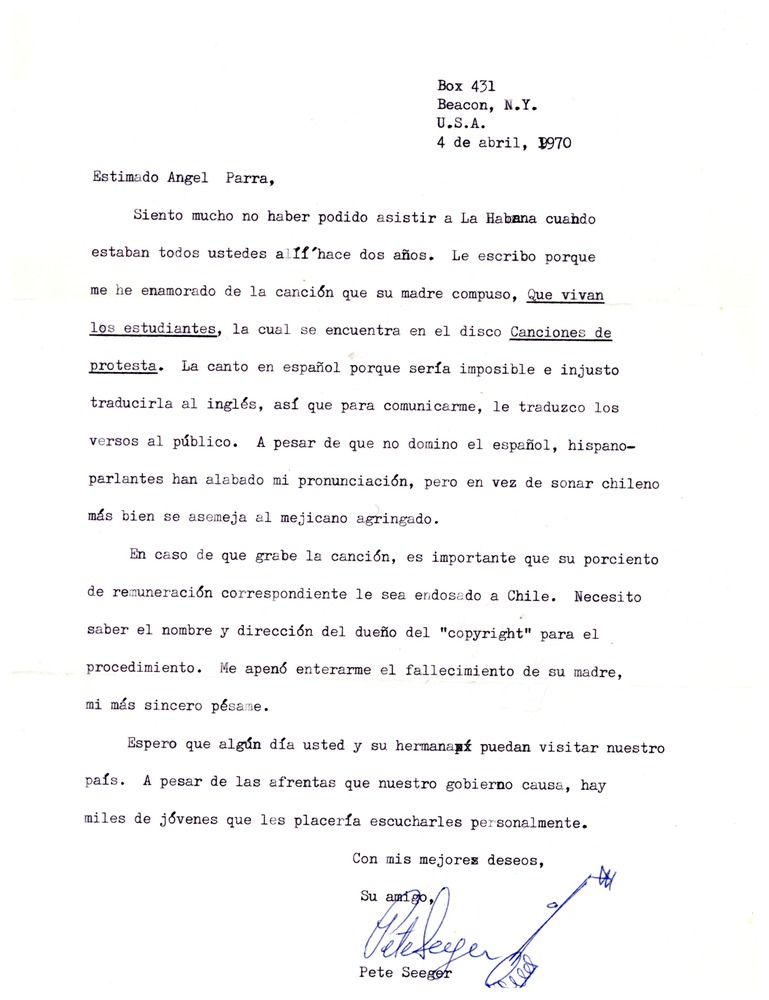 Carta mecanografiada de Pete Seeger a Ángel Parra donde cuenta que ha interpretado la el tema "Que vivan los estudiantes" de Violeta Parra y solicita información de los derechos de autor del tema en caso de que decida grabarla. Incluye firma de Pete Seeger.