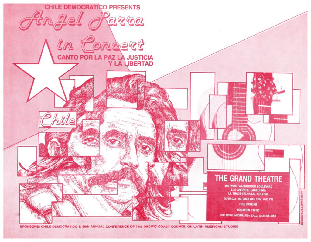 Afiche del cocierto de Ángel Parra en The Grand Theatre de Los Ángeles, organizado por Chile democrático y la 30° Annual Conference of the Pacific Coast Council on Latin American Studies, y realizado el 20 de octubre de 1984.
