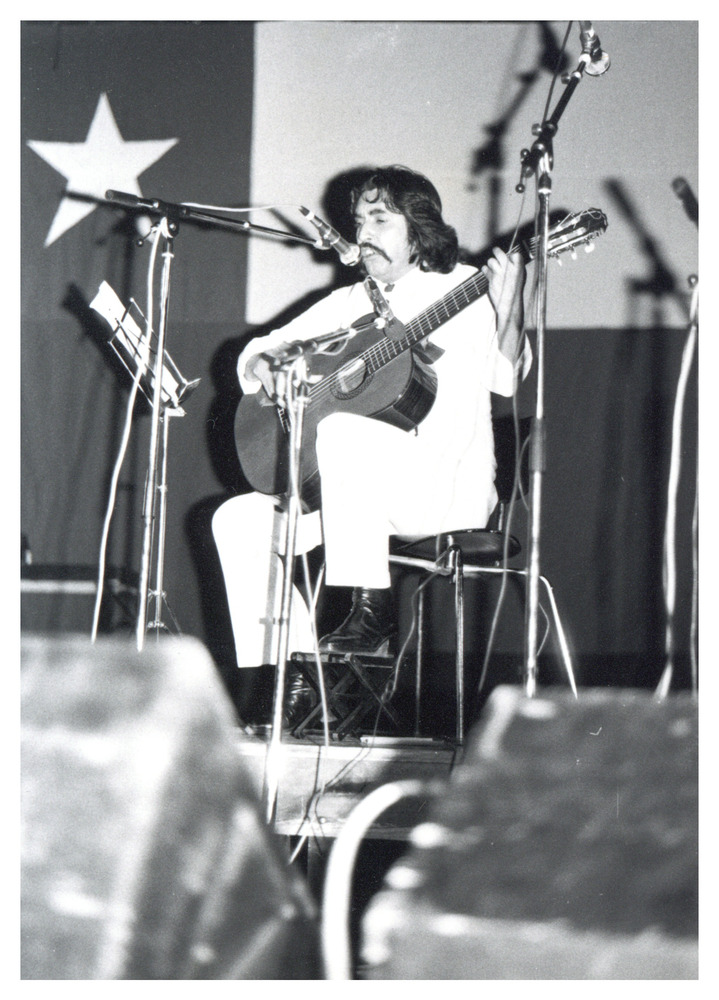 Fotografía en blanco y negro. En el área central, vestido de blanco, aparece Ángel Parra sentado y sobre una tarima. Sujeta su guitarra y tiene un micrófono en frente. De fondo se observa la bandera de Chile. En el reverso aparece la fecha entrecortada.
