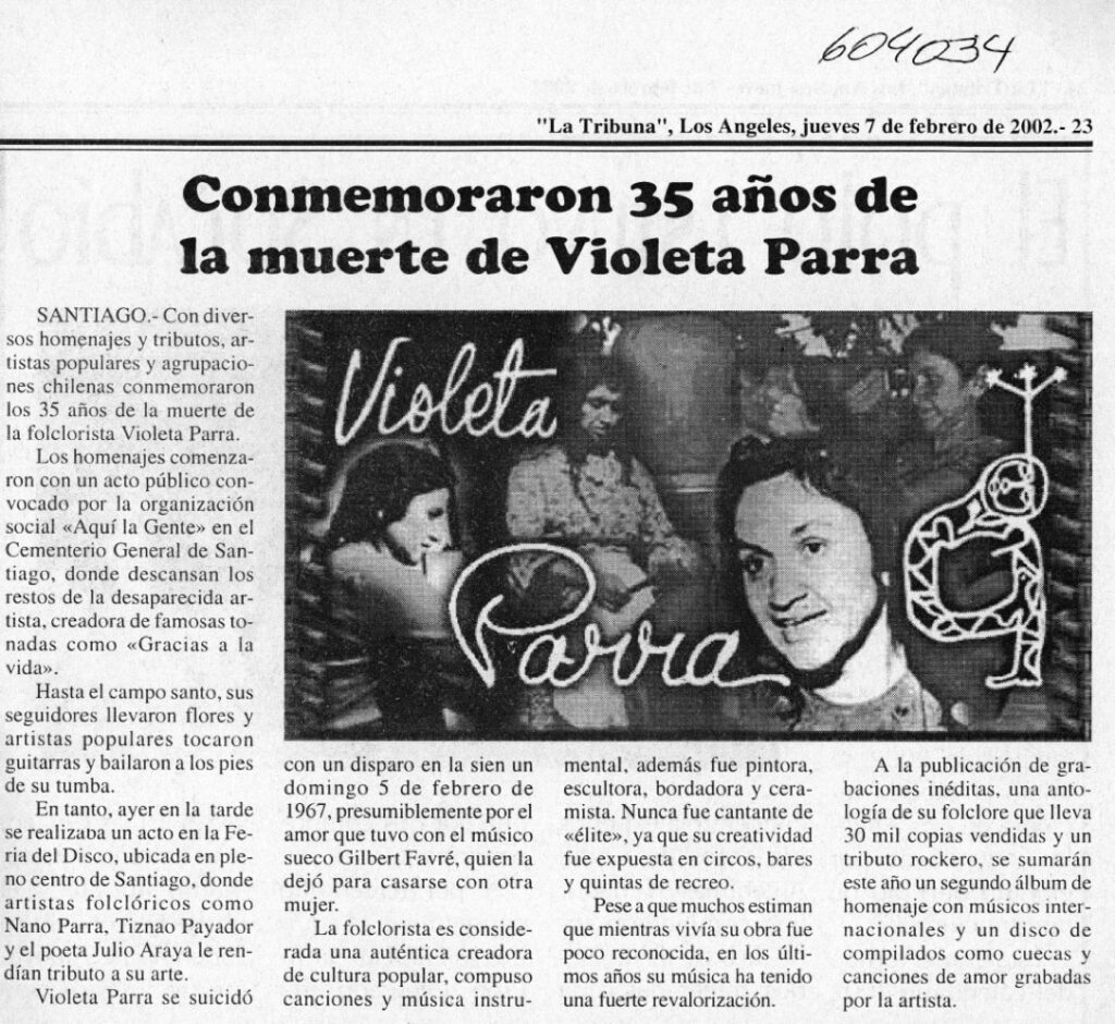 El artículo informa sobre los diversos homenajes y tributos, con que artistas populares y agrupaciones chilenas conmemoraron los 35 años de la muerte de la folclorista Violeta Parra. Los homenajes comenzaron con un acto público convocado por la organización social “Aquí la Gente» en el Cementerio General de Santiago. La nota agrega que a la publicación de grabaciones inéditas, una antología de su folclore que lleva 30 mil copias vendidas y un tributo rockero, “se sumarán este año un segundo álbum de homenaje con músicos internacionales y un disco de compilados como cuecas y canciones de amor grabadas por la artista”.