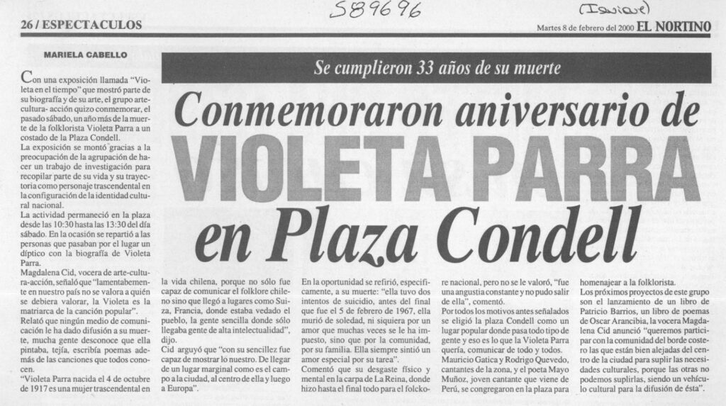 Al cumplirse 33 años del fallecimiento de Violeta Parra se realizó la exposición “Violeta en el tiempo”, con aspectos de su biografía y de su obra artística, organizada por el grupo arte-cultura- acción. La actividad se realizó a un costado de la Plaza Condell.