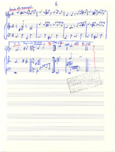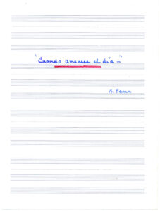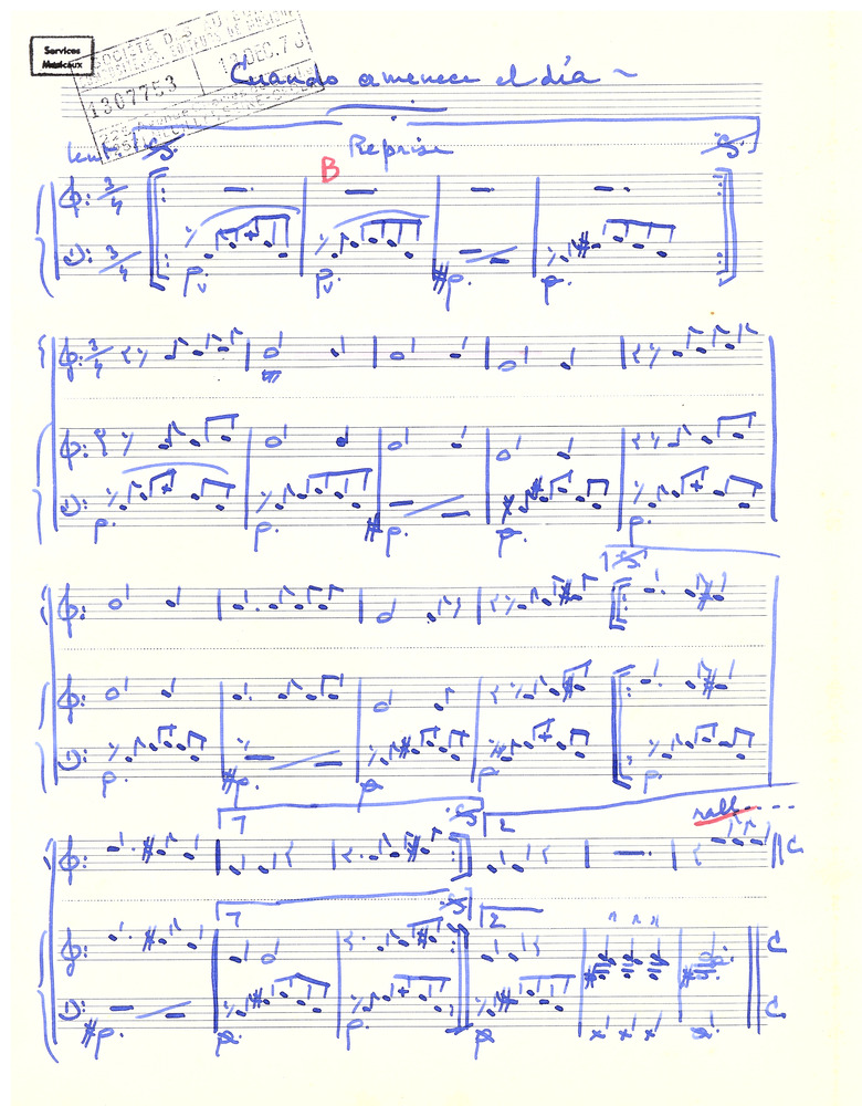 Partitura escrita a mano de "Cuando amanece el día". La primera carilla indica el título. Las dos siguientes traen la partitura y el timbre de la Sociedad de autores, compositores y editores de música (en francés); el número de registro 1307753, la fecha 13 de diciembre de 1976 y una dirección ilegible. La última carilla se encuentra sin anotaciones.