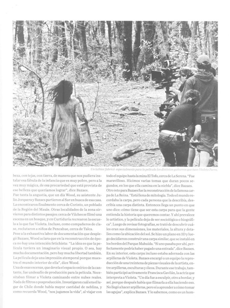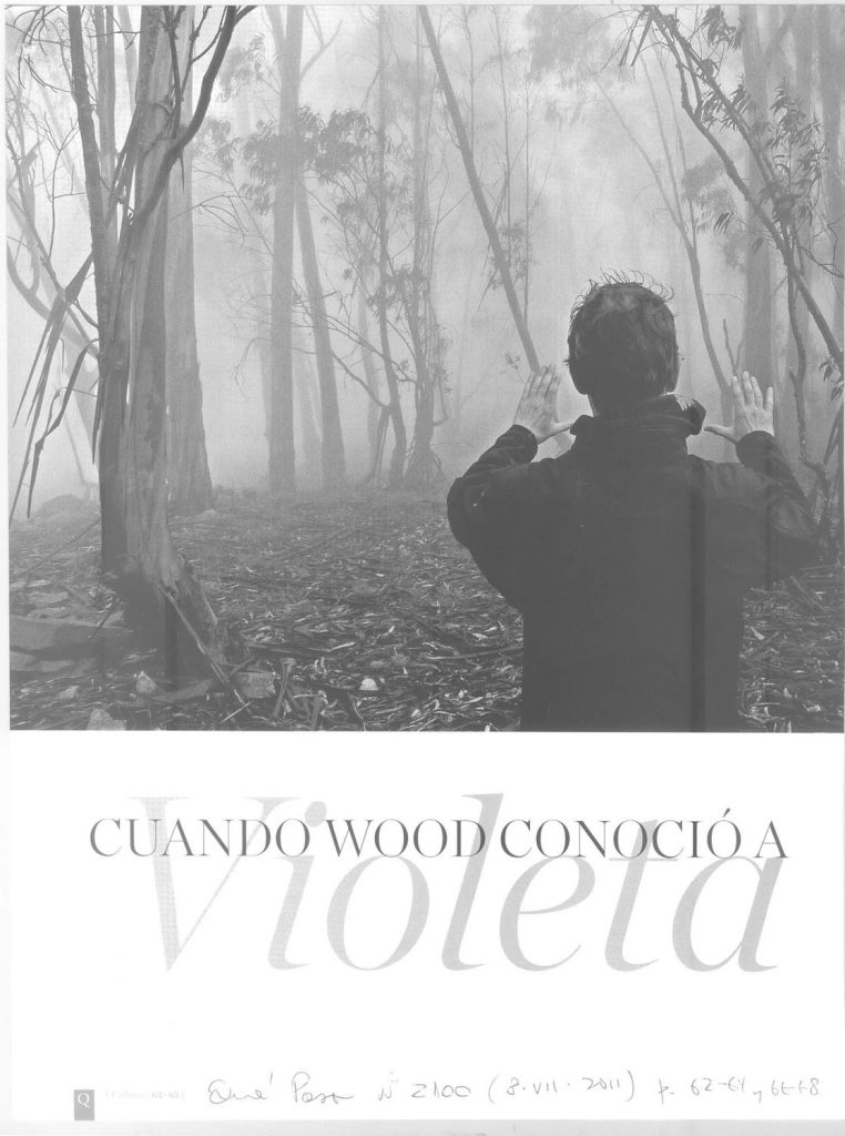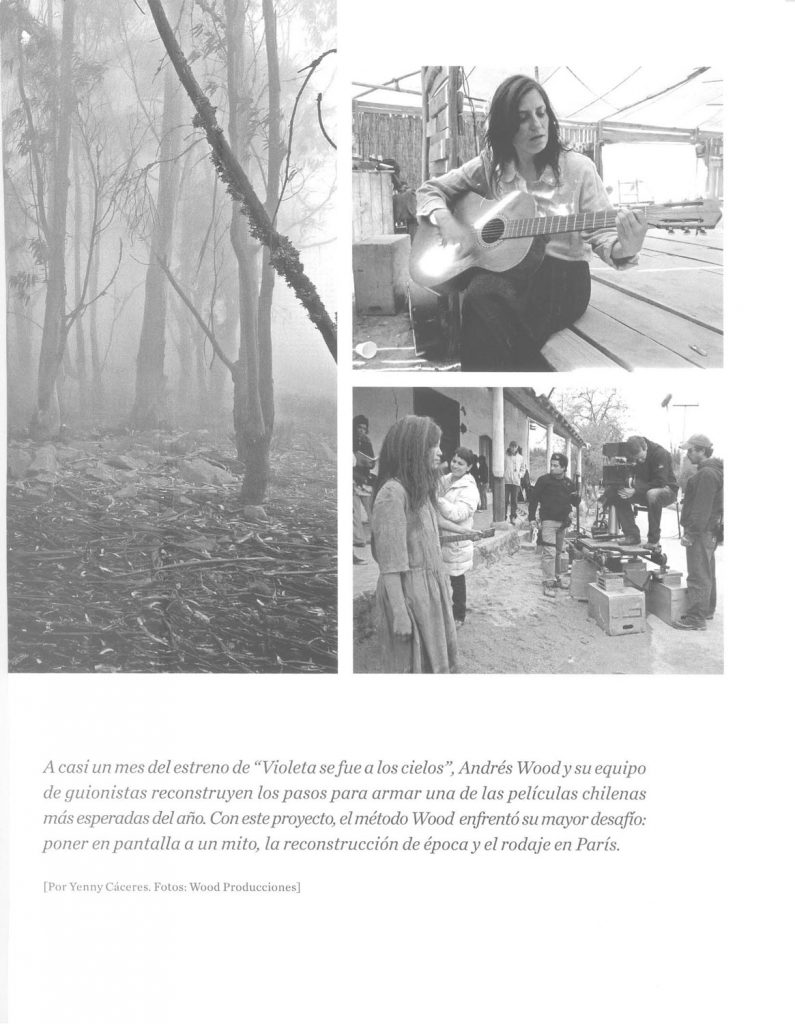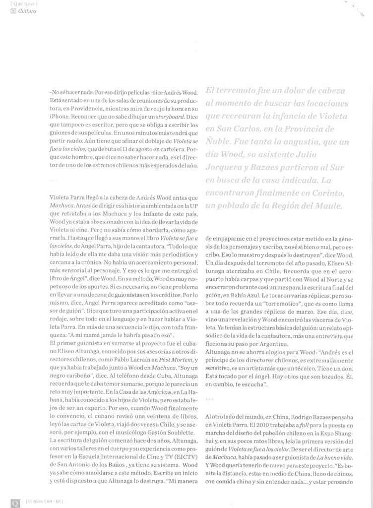 Artículo periodístico sobre la realización de la película «Violeta se fue a los cielos», dirigida por Andrés Wood. Revista Qué Pasa , diario La Tercera. Santiago, Chile. 8 de julio de 2011.