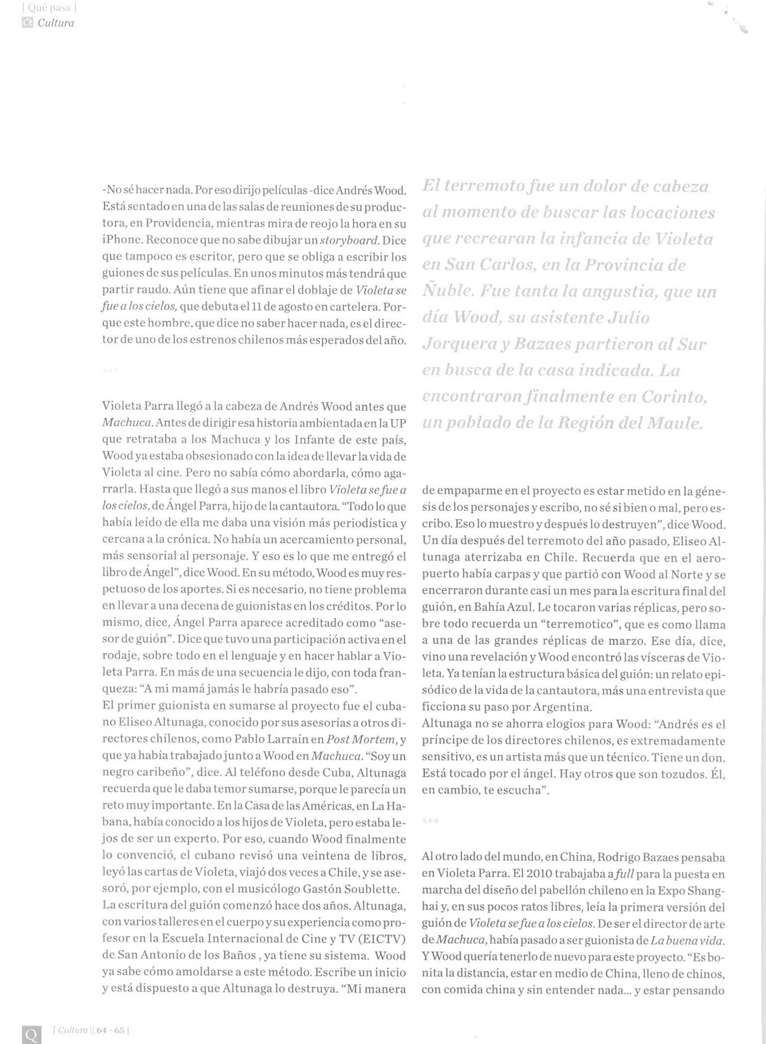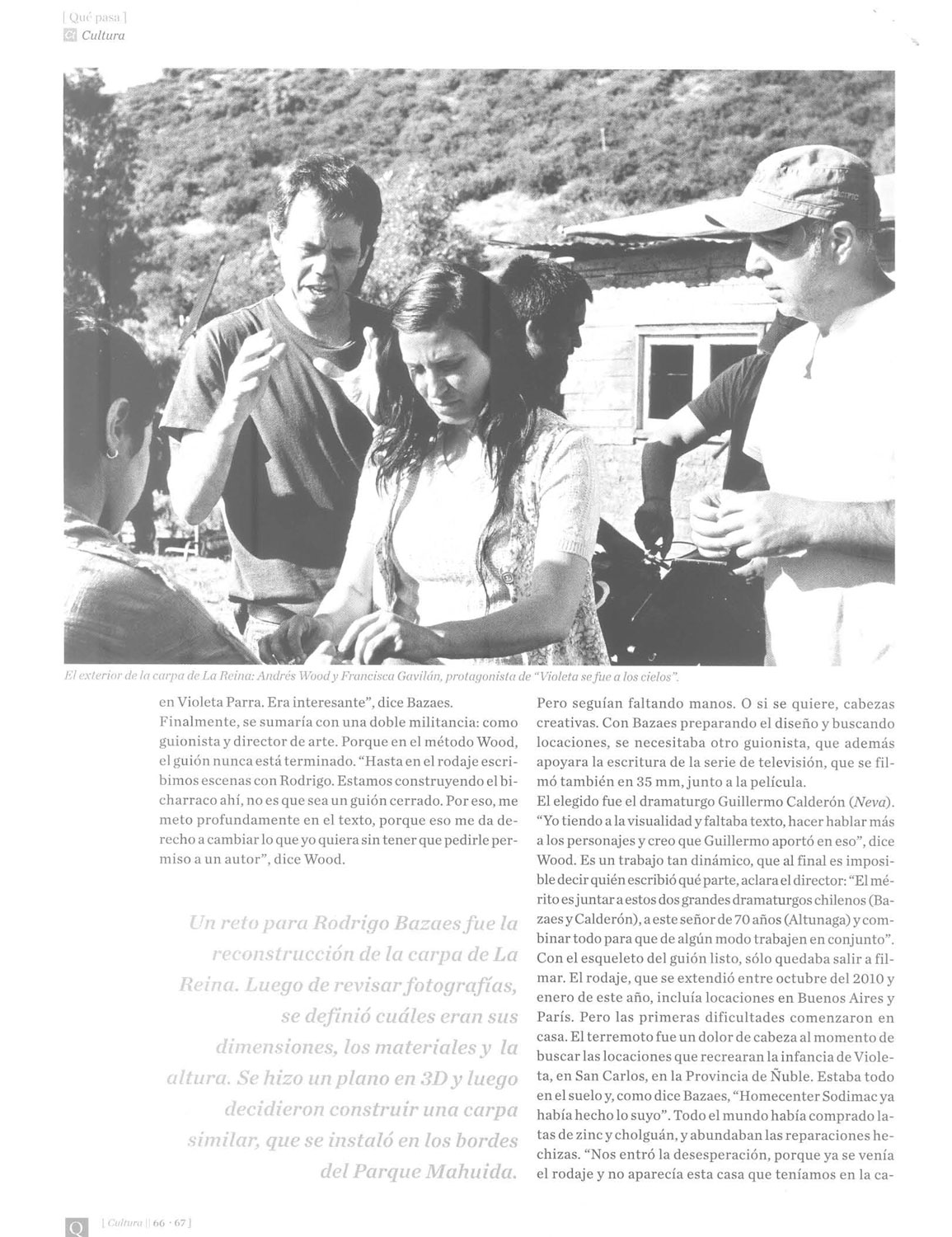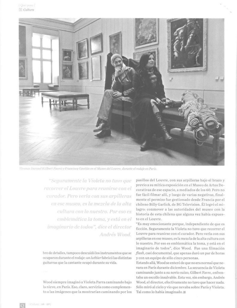 Artículo periodístico sobre la realización de la película «Violeta se fue a los cielos», dirigida por Andrés Wood. Revista Qué Pasa , diario La Tercera. Santiago, Chile. 8 de julio de 2011.