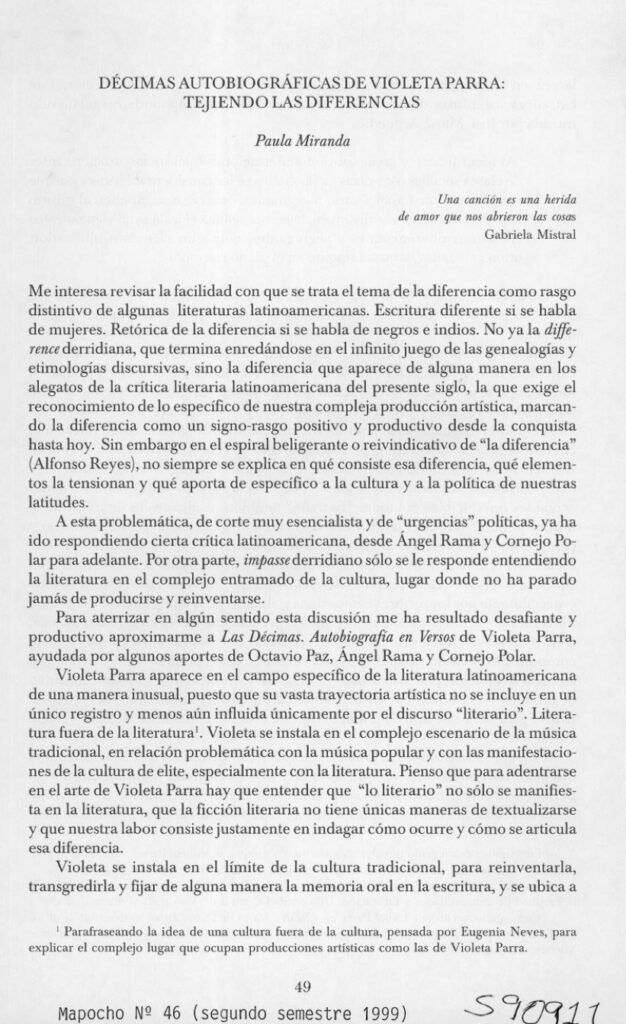 Revisando el tema de la diferencia como rasgo distintivo de algunas literaturas latinoamericanas, especialmente de escrituras de mujeres, la investigadora Paula Miranda se aproxima a las “Décimas. Autobiografía en versos”, de Violeta Parra. Para la autora, “Violeta Parra aparece en el campo específico de la literatura latinoamericana de una manera inusual, puesto que su vasta trayectoria artística no se incluye en un único registro y menos aún influida únicamente por el discurso ‘literario’”. En Violeta Parra hay “literatura fuera de la literatura”. En el planteamiento de la ensayista Violeta Parra se instala en el límite de la cultura tradicional, “para reinventarla, transgredirla y fijar de alguna manera la memoria oral en la escritura, y se ubica a la vez en las fracturas del gran arte, para producir en relación a él reacciones de extrañeza, asombro y desconcierto”. En un interesante desarrollo sobre memorias y diferencias, paula Miranda concluye describiendo a Violeta Parra, a partir del análisis de sus “Décimas” como: “Mujer instalada más allá de todo estereotipo, pero tensionada por ellos. Campesina emigrada a la urbe, pero jamás completamente citadina. Mestizaje que es esa mezcla extraña de conflictos socioculturales instalados por la modernidad. Autobiografía que no sólo habla de sí misma, sino de familias e historias chilenas. Tonos y encuadres diversos para problemáticas distintas. Décimas que siguen la tradición de la poesía popular, pero que a la vez la ‘desafían’.