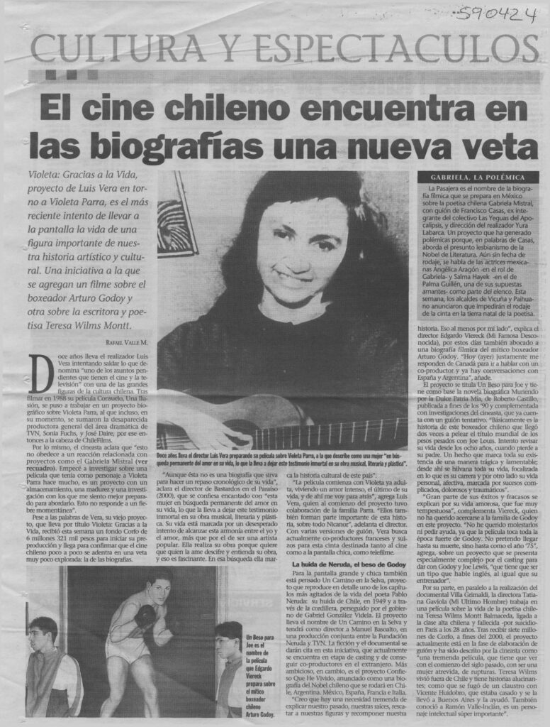 La nota se refiere a los intentos del cine chileno de llevar a la pantalla biografías de personajes de la cultura chilena, como Gabriela Mistral, Arturo Godoy y Violeta Parra. Sobre esta última el realizador Luis Vera declara que desde hace doce años intenta saldar lo que denomina “uno de los asuntos pendientes que tienen el cine y la televisión” con una de las grandes figuras de la cultura chilena, quien trabaja en un proyecto biográfico sobre Violeta Parra, al que incluso, en su momento, se sumaron la desaparecida productora general del área dramática de TVN, Sonia Fuchs, y José Daire, por ese entonces a la cabeza de ChileFilms. El proyecto de película se llama “Gracias a la vida” y recibió recursos de CORFO de “6 millones 321 mil pesos” para iniciar la preproducción. “La película comienza con Violeta, viviendo un amor intenso, el último de su vida, y de ahí me voy para atrás”, agrega Luis Vera, quien al comienzo del proyecto tuvo colaboración de la familia Parra. “Ellos también forman parte importante de esta historia, sobre todo Nicanor”, adelanta el director. Con varias versiones de guión, Vera busca actualmente co-productores franceses y suizos para esta cinta destinada tanto al cine como a la pantalla chica, como telefilme.