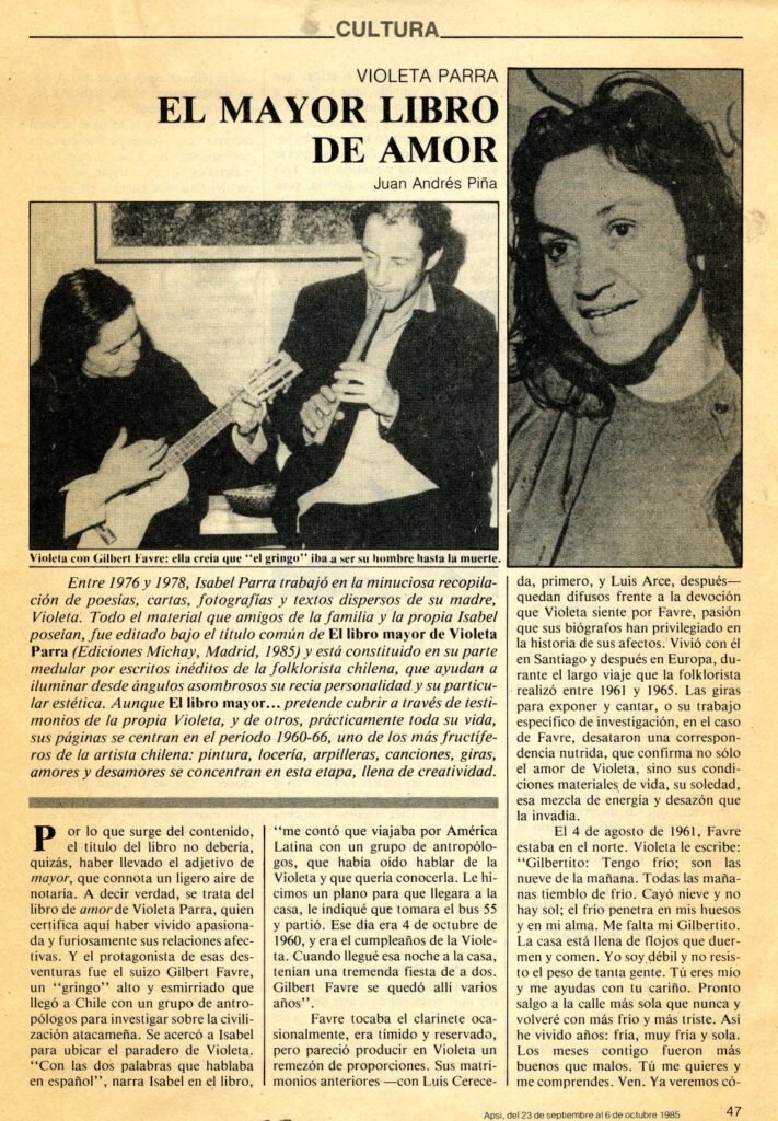 Artículo, más que reseña del “Libro Mayor” de Isabel Parra; considerado por Juan Andrés Piña como una gran obra de amor de Violeta Parra, con la minuciosa recopilación de cartas, poemas, fotografías y detalles cotidianos recopilados por su hija mayor.