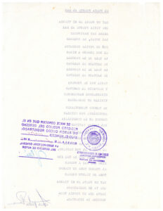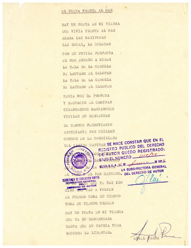 Documento mecanografiado donde se consigna la letra del tema "El poeta frente al mar". Incluye la firma de Ángel Parra y timbre de la Dirección General del Derecho de Autor de México D. F., que señala el número 1119/75 y la fecha 4 de junio de 1975.