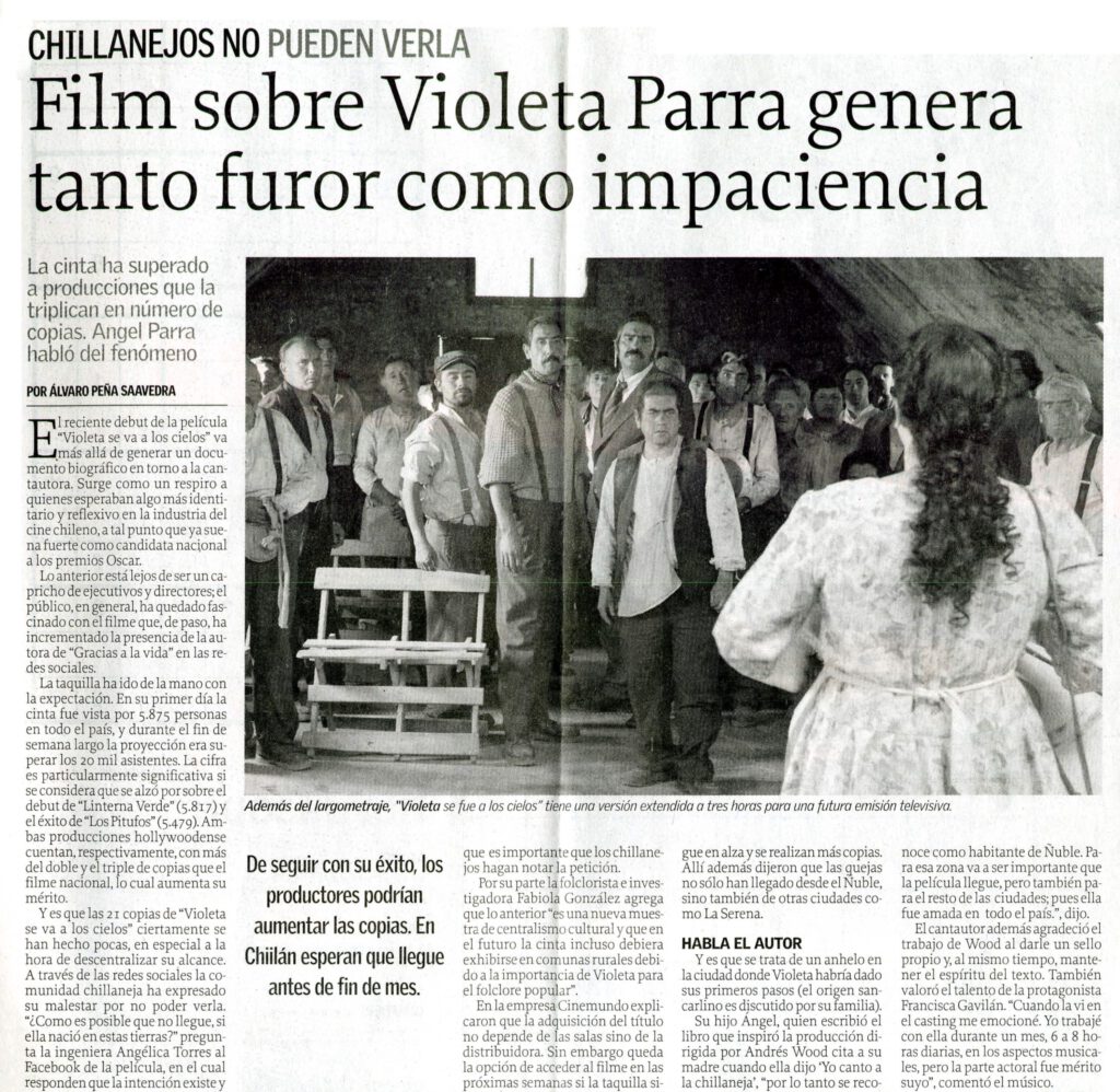 Artículo que destaca el éxito de la película “Violeta se fue a los cielos” de Andrés Wood, pero que, sin embargo, critica el centralismo cultural predominante en Chile. Esto, porque el filme dedicado a la cantautora chilena no consideró en su estreno nacional su exhibición en Chillán, territorio fundamental en la vida de la folklorista.