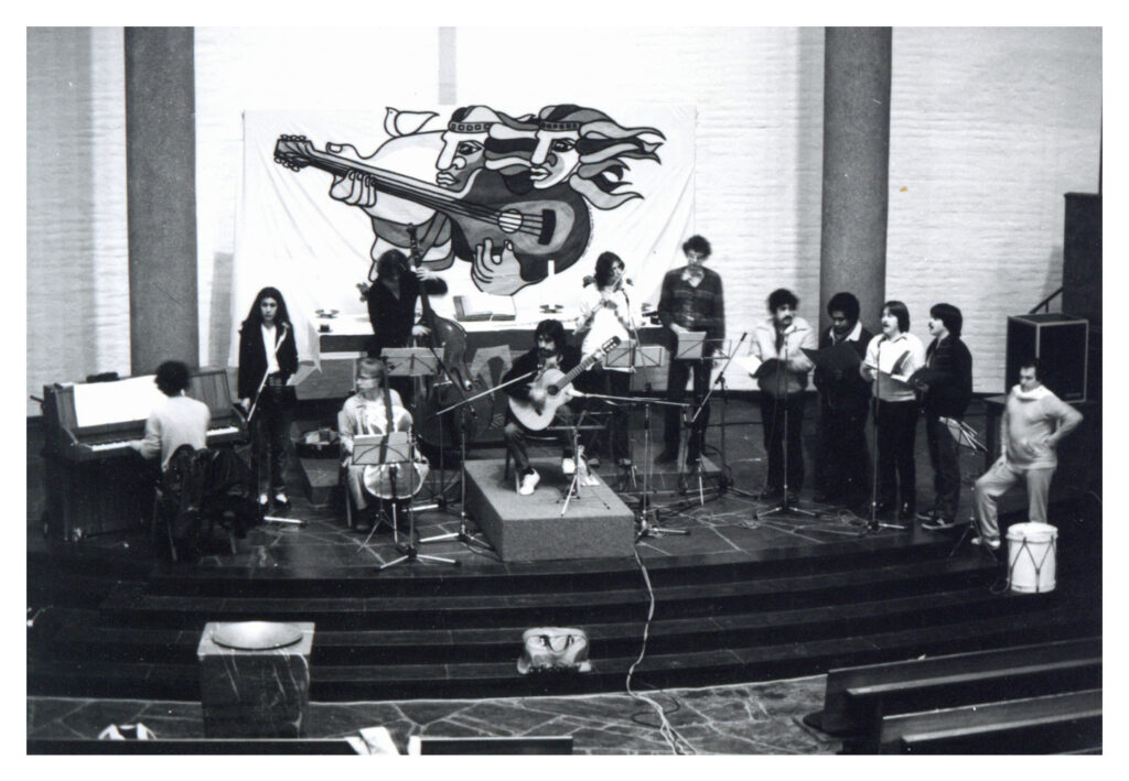 Fotografía en blanco y negro de orientación horizontal y en plano general. La zona central de la imagen se concentra un grupo de músicos adelante de un lienzo pintado. Al centro del grupo se observa a Ángel Parra, sentado y sobre una tarima, con su guitarra.