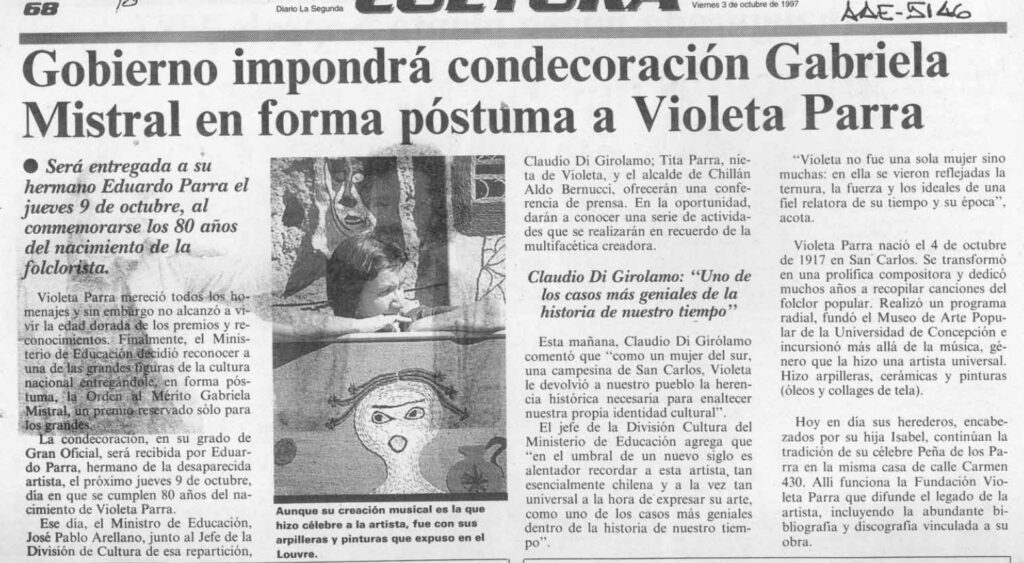 Este artículo se refiere a la entrega de la Condecoración Gabriela Mistral entregada a la familia de Violeta Parra, el de octubre de 1997. Claudio Di Girólamo, Jefe de la División de Cultura del Ministerio de Educación sostuvo lo siguiente: “Violeta Parra es uno de los casos más geniales de la historia de nuestro tiempo”. Incluye una breve reseña donde explica el trabajo realizado por la Fundación Violeta Parra en lo que fue antiguamente La Peña de Los Parra ubicada en calle Carmen 340 Santiago.