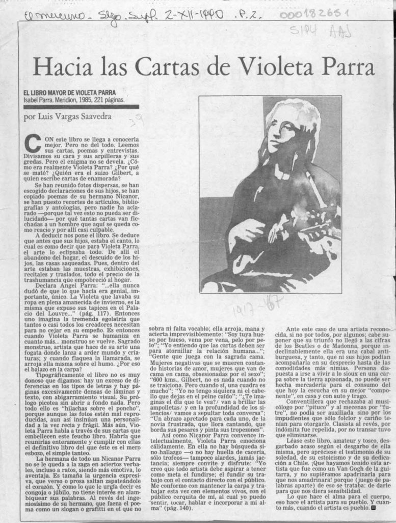 Crítica literaria al libro escrito por Isabel Parra “El Libro Mayor de Violeta Parra”, ediciones Meridión (1985- 221 páginas). Este libro contiene, cartas, entrevistas de Violeta Parra y testimonios de sus amigos que tuvieron el privilegio de conocerla. El crítico encuentra que este libro es superficial, que los testimonios de sus amigos y las cartas, no reflejan la verdadera personalidad y obra de la artista.