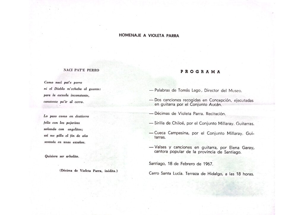 Folleto que da cuenta del programa del homenaje que realizó el Museo de Arte Popular Americano de la Universidad de Chile en honor a Violeta Parra, el 18 de febrero de 1967 en su sede del Castillo Hidalgo del Cerro Santa Lucía. Se consigna participación de conjunto Aucán, Millaray y de la cantora popular Elena Garay.