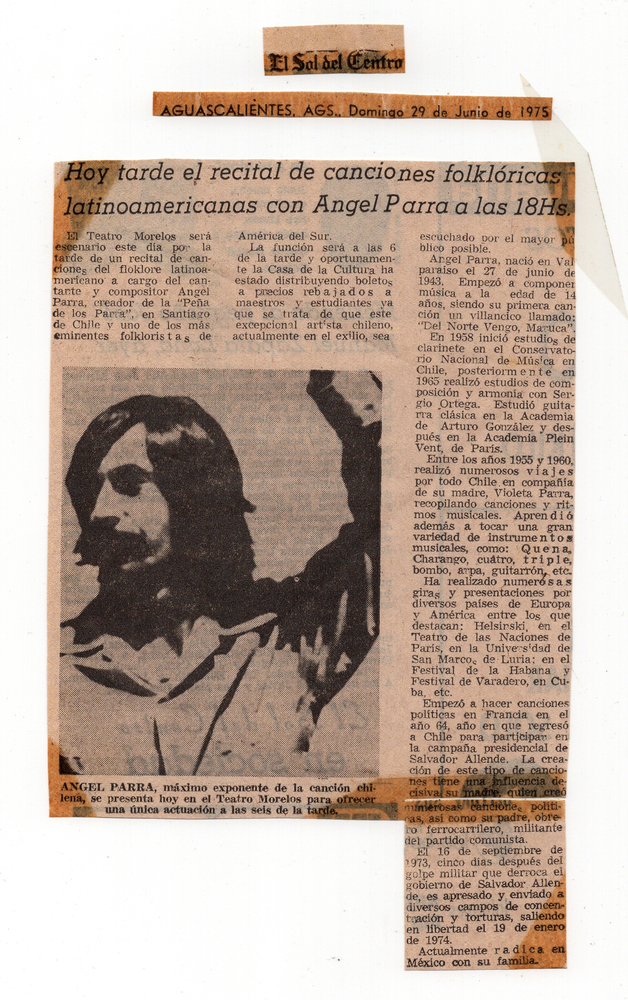 Nota de prensa que anuncia el recital que dará ese día (29 de junio de 1975) en el Teatro Morelos y, a continuación, hace un repaso por la carrera artística de Ángel Parra, desde sus inicios hasta ese momento. Incluye fotografía de plano medio del cantautor.