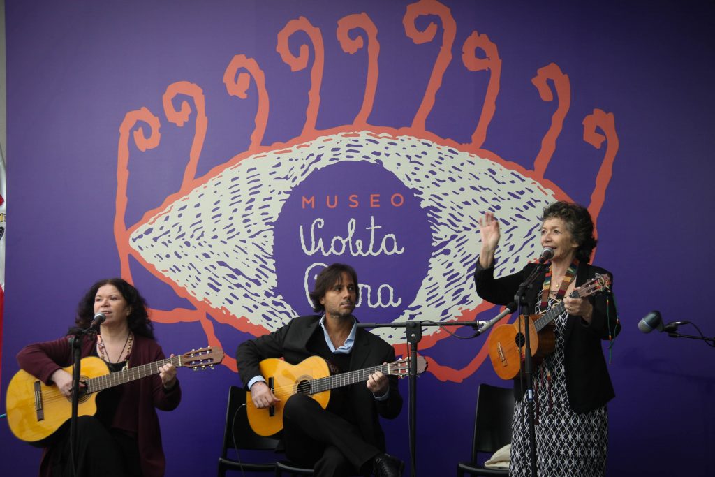 Isabel Parra en la inauguración del Museo Violeta Parra, presentándose junto a Tita Parra y Roberto Trenca.