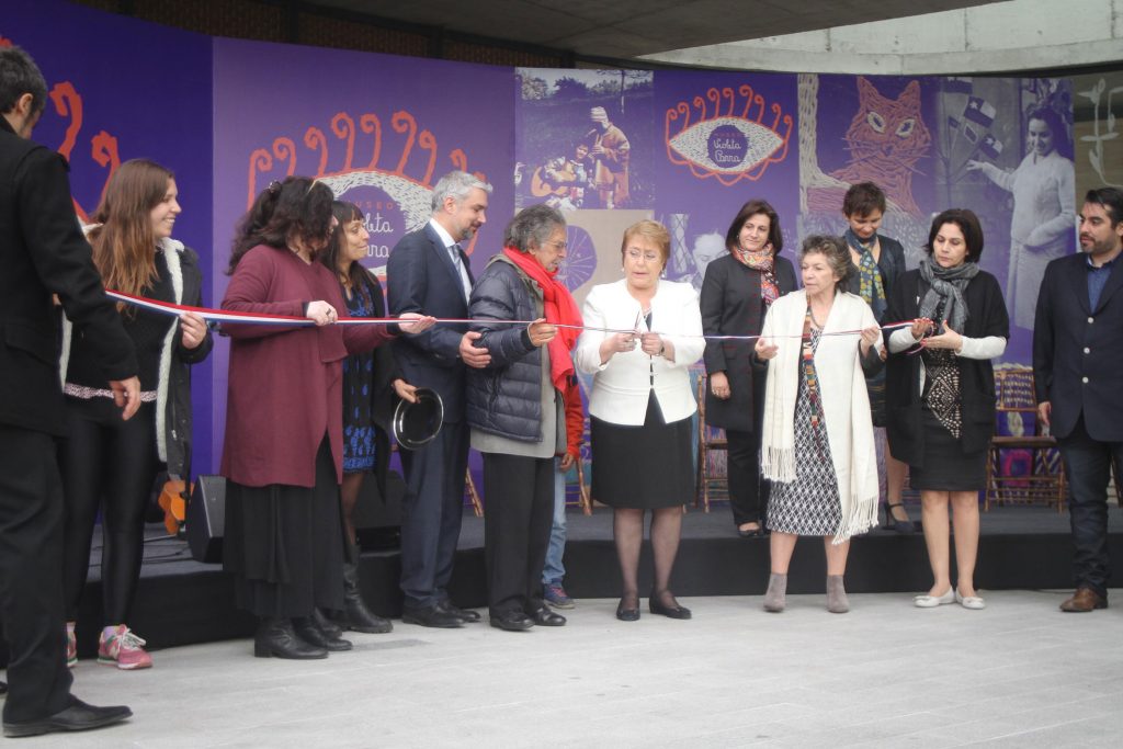 Inauguración del Museo Violeta Parra con la presencia de la Presidenta de la República Michelle Bachelet Jeria, los hermanos Ángel e Isabel Parra, el Ministro de Cultura Ernesto Ottone; Cecilia García-Huidobro, Presidenta del directorio de la Fundación Museo Violeta Parra; Milena Rojas, Jefa de Colección y Patrimonio del Museo Violeta Parra; Leonardo Mellado, Director del Museo Violeta Parra; Tita Parra y Javiera Parra.