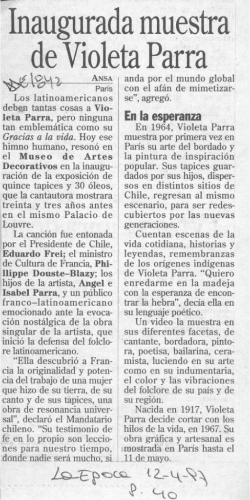 Esta pequeña reseña da cuenta de la segunda exposición de Violeta Parra en el Museo de Artes Decorativas del Palacio del Louvre el año 1997. Se exhibieron quince arpilleras y treinta óleos. Fue inaugurada por el Presidente de Chile, Eduardo Frei, el Ministro de Cultura de Francia, Philippe Douste-Blazy, los hijos de Violeta Parra, Isabel y Ángel Parra. En este vernissage participó el público franco-latinoamericano.