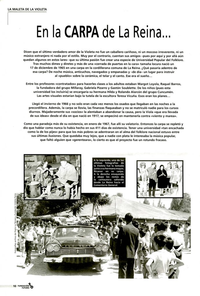 El artículo se refiere a lo difícil que fue el proyecto de La Carpa de La Reina. Incluye fotografías de la artista, de Nicanor Parra y del funeral de Violeta Parra.