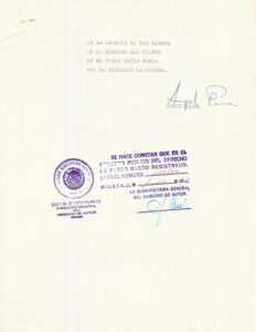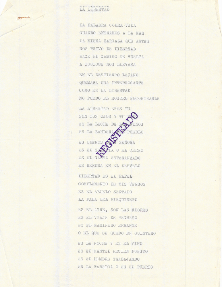 Documento mecanografiado donde se consigna la letra del tema "La libertad". En la página una lleva un timbre que indica "Registrado", en la siguiente carilla incluye la firma de Ángel Parra y timbre de la Dirección General del Derecho de Autor de México D. F., que señala el número 1119/75 y la fecha 4 de junio de 1975.