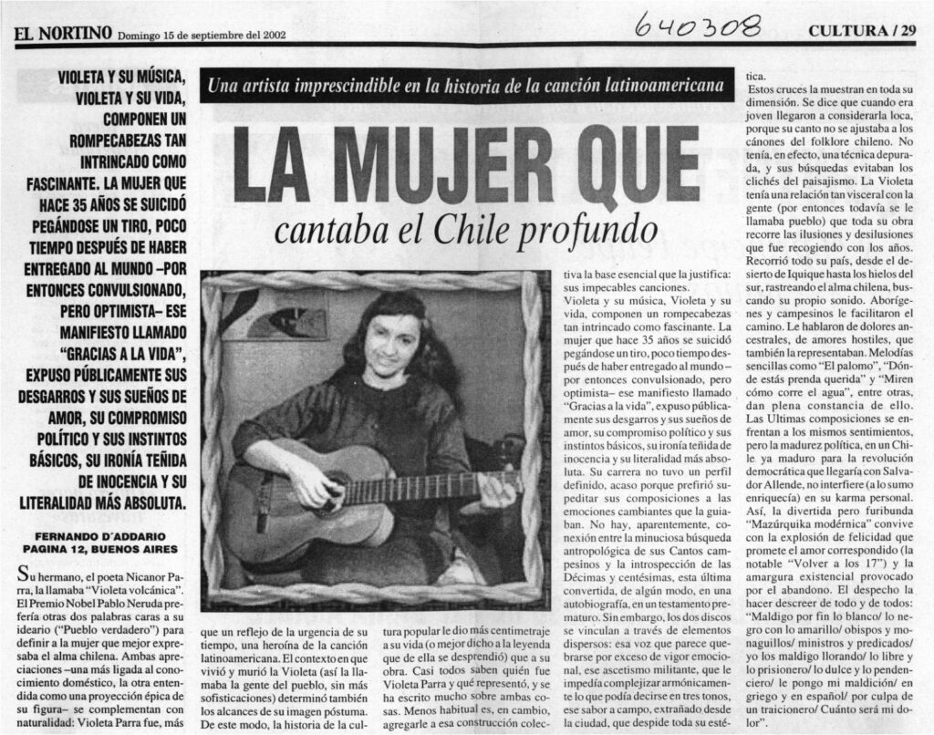 El artículo es una reproducción que hace el medio iquiqueño del artículo de Fernando D'Addario publicado en “Página 12” de Buenos Aires. Centralmente plantea: “Violeta y su música, Violeta y su vida, componen un rompecabezas tan intrincado como fascinante. La mujer que hace 35 años se suicidó pegándose un tiro, poco tiempo después de haber entregado al mundo - por entonces convulsionado, pero optimista- ese manifiesto llamado “Gracias a la vida”, expuso públicamente sus desgarros y sus sueños de amor, su compromiso político y sus instintos básicos, su ironía teñida de inocencia y su literalidad más absoluta. Su carrera no tuvo un perfil definido, acaso porque prefirió supeditar sus composiciones a las emociones cambiantes que la guiaban. No hay, aparentemente, conexión entre la minuciosa búsqueda antropológica de sus Cantos campesinos y la introspección de las Décimas y centésimas, esta última convertida, de algún modo, en una autobiografía, en su testamento prematuro”. El artículo incluye fotografía de Violeta Parra.