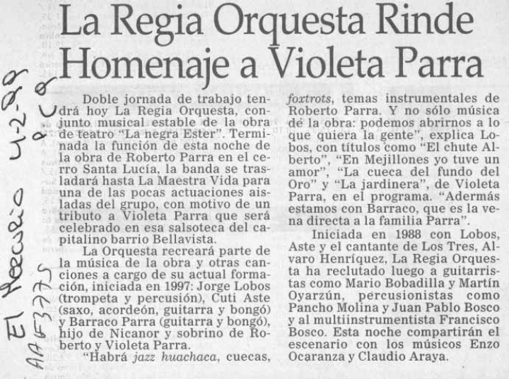 El artículo se refiere al trabajo de “La Regia Orquesta”, conjunto musical estable de la obra de teatro “La Negra Ester”, dirigida por el director de teatro, Andrés Pérez. Esta orquesta inició su trabajo el año 1988 y está compuesta por músicos destacados del ámbito cultural y artístico chileno que interpretan canciones populares de Roberto y Violeta Parra.