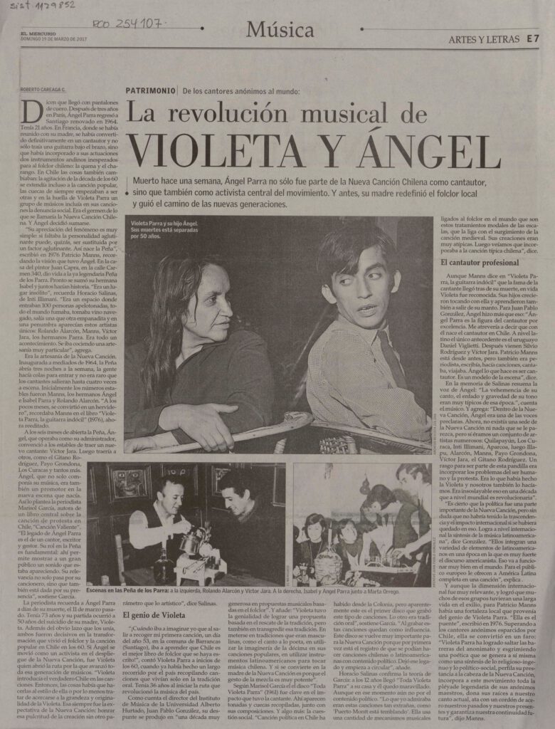Con motivo del fallecimiento de Ángel Parra, hijo de Violeta Parra, el artículo hace un recorrido por la trayectoria del cantautor y su relación con la obra de su madre, a quien acompañó desde niño en sus tareas de recopilación como en sus viajes fuera de Chile. Además, el artículo destaca su participación en la Peña de los Parra y el inicio del movimiento de la Nueva Canción Chilena.