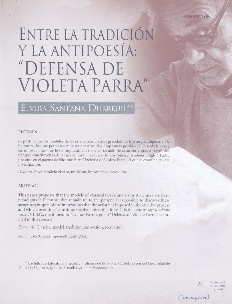 “Entre la tradición y la antipoesía: Defensa de Violeta Parra”. Artículo académico que analiza el poema de Nicanor Parra, “Defensa de Violeta Parra”. Investiga la utilización de la estrofa sáfica adónica del Siglo VI a.C. en este poema.