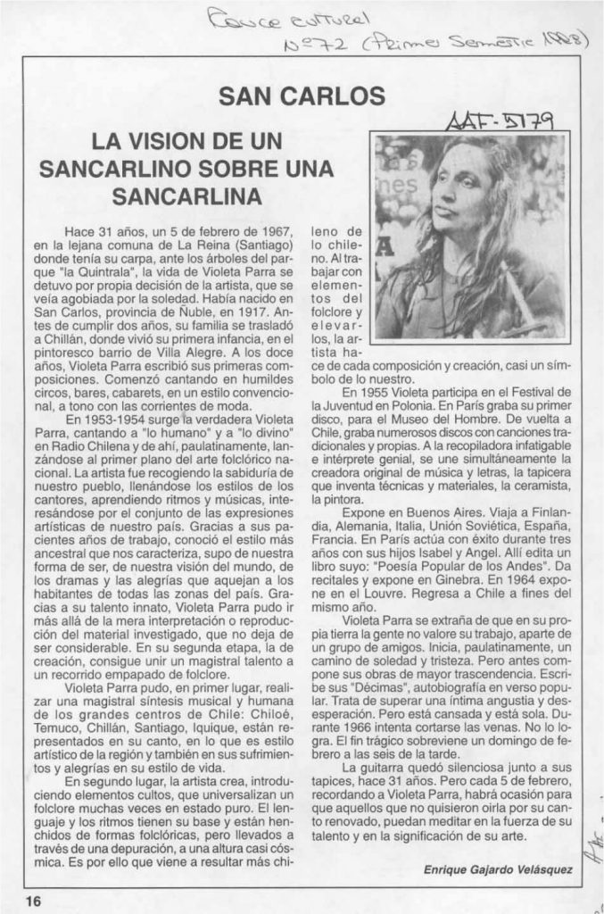 Artículo que se refiere a los 31 años desde el suicidio de Violeta Parra. El artículo tiene una reseña biográfica de Violeta Parra.