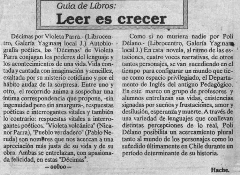 En esta reseña del libro de Violeta Parra “Décimas. Autobiografía en versos” el autor plantea que la autora cuenta su historia con mucha imaginación y sencillez. Se trata de un recorrido sobre las diferentes etapas de su vida.